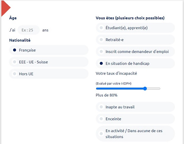 Par exemple, si vous êtes en situation de handicap, vous devez préciser votre taux d’incapacité à l’aide du curseur, les aides variant en fonction de cette information :