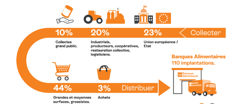 Les Banques Alimentaires ne fonctionnent pas du tout de la même manière puisqu’elles collectent majoritairement des dons (industrie, agricole, grande distribution, État/UE) et complètent si besoin par des achats et les redistribuent ensuite à leurs 6 044 associations, CCAS et épiceries sociales partenaires.