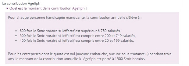 - Si vos interrogations concernent le fonctionnement général de l’Agefiph (aides, services, dispositions légales, etc.) ou les règles qui lient handicap et emploi : vous pouvez consulter la Foire Aux Questions (FAQ) du site. De nombreuses réponses sont apportées en fonction de votre profil (personne handicapée ou représentant d’une entreprise). Vous n’avez qu’à cliquer sur la question qui correspond à la vôtre pour obtenir une réponse claire et synthétique (voir exemple ci-dessous).