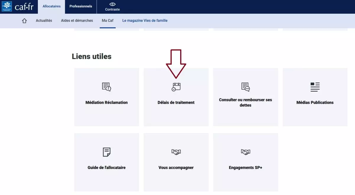 Pour ce faire, cliquez sur la rubrique « Ma Caf » et descendez jusqu’à la section « Liens utiles » et cliquez sur « Délais de traitement » ou « Où en est mon dossier ».