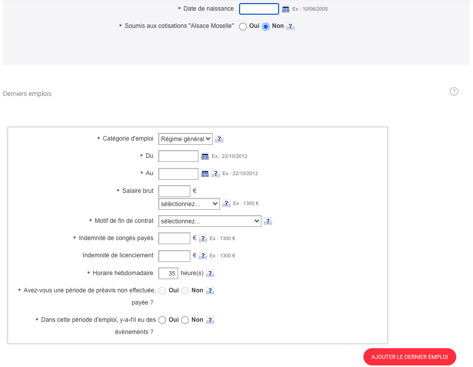 Rendez-vous sur https://candidat.pole-emploi.fr/candidat/simucalcul/perteemploi. Après avoir renseigné votre date de naissance, vous préciserez si vous êtes assuré(e) au régime local d’assurance maladie d’Alsace-Moselle. Depuis le 1er janvier 2012, une cotisation supplémentaire est applicable : 1,5%